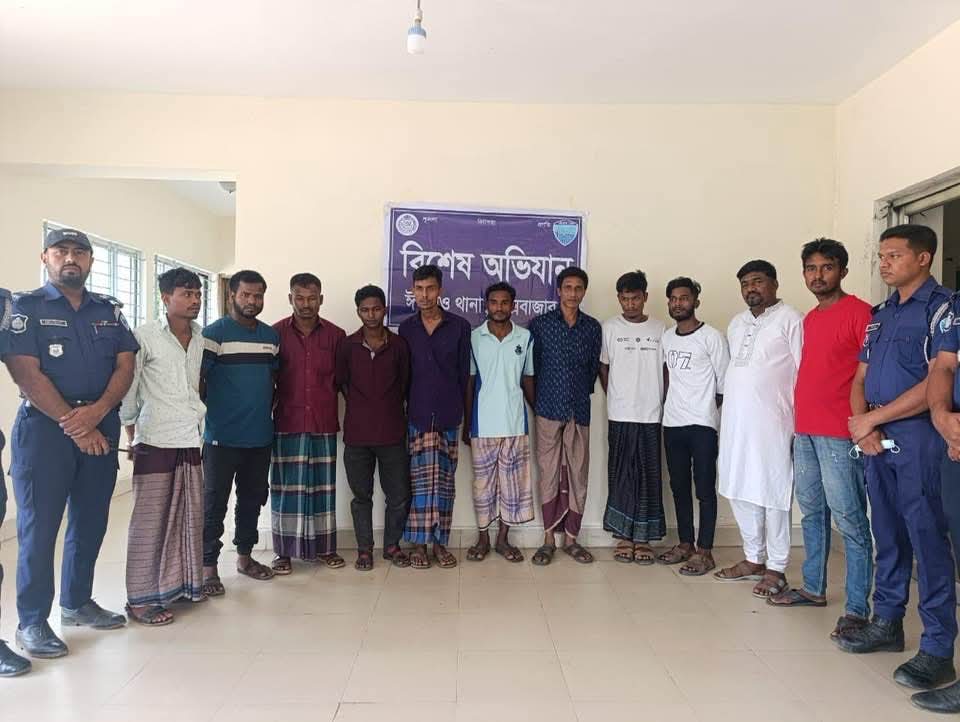 গ্রেফতারকৃতরা হলো নুরুল আজিম (২৪), পিতা- নজির আহমদ, নুরুল আবছার (২৯), পিতা- মনির আহমদ, রবিউল (২৩), পিতা- নুরুল আজিম, মনির (৩০), পিতা-মৃত জামাল, আনোয়ার হোসেন (২৫), পিতা-মোক্তার হোসেন, মোঃ রাসেল (২০), পিতা- নুরুল বশর, মোঃ রফিক (২১), পিতা-রমজান আলী, আব্দুল হাকিম (৪০), পিতা-মৃত হাফিজুর রহামন, সর্ব গ্রাম- পূর্ব বামন কাটা, আবুল হোসেন (৫০), পিতা-মৃত মোঃ আলী, সর্ব সাং- ভিলেজারপাড়া, মোঃ শাফি (৩৬), পিতা- মোঃ মোক্তার, সাং- হাজি পাড়া, সর্ব ইউপি ইসলামপুর, মোঃ জাবেদ (২৮), পিতা- মৃত শামশুল আলম, সাং- আউলিয়াবাদ, ইসলামাবাদ, সর্ব থানা- ঈদগাঁও, কক্সবাজার।