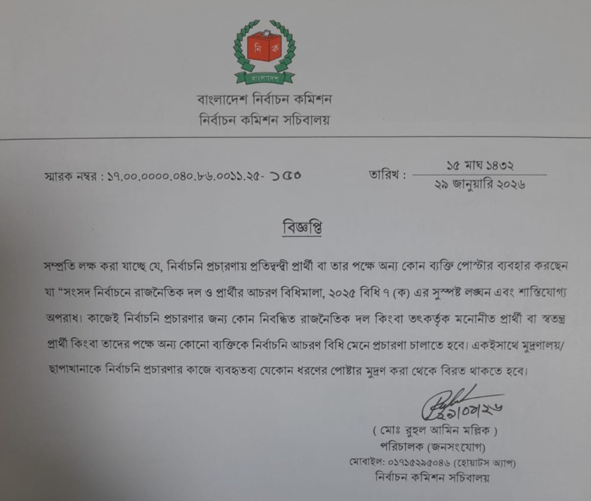 নির্বাচন কমিশনের পক্ষ থেকে পাঠানো ওই চিঠিতে স্পষ্ট উল্লেখ করা হয়েছে যে, রাজনৈতিক দল ও প্রার্থীর আচরণ বিধিমালার বিধি-৭(ক) অনুযায়ী নির্বাচনে কোনো প্রকার পোস্টার ব্যবহার করা যাবে না। এর পরিবর্তে প্রার্থীরা কেবল নির্ধারিত লিফলেট বা হ্যান্ডবিল ব্যবহার করতে পারবেন।
