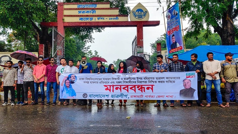 ঢাকা বিশ্ববিদ্যালয়ের সাধারণ শিক্ষার্থী ও ছাত্রলীগের উপর বহিরাগত ছাত্রদলের হামলার প্রতিবাদে এবং সকল শিক্ষার্থীদের নিরাপত্তা নিশ্চিত করার দাবিতে মানববন্ধন করেছে রাঙামাটি জেলা ছাত্রলীগ।