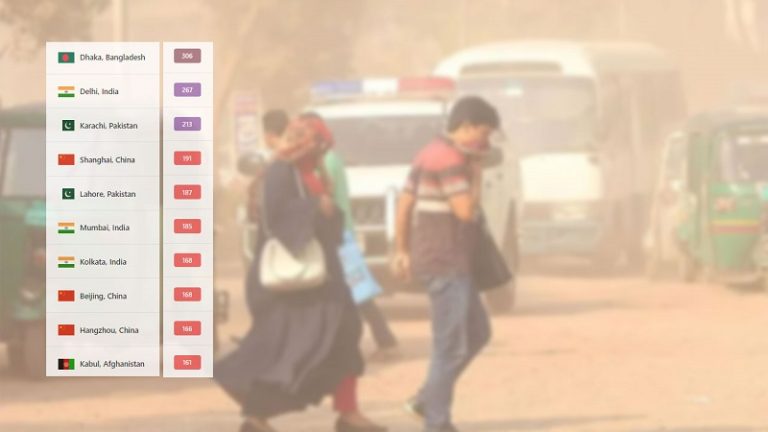 তালিকার শীর্ষে অবস্থান করা ঢাকার বায়ুর মানের স্কোর হচ্ছে ৩০৬ অর্থাৎ এখানকার বায়ু আজ ‘দুর্যোগপূর্ণ’ পর্যায়ে রয়েছে। দ্বিতীয় অবস্থানে রয়েছে ভারতের দিল্লি। শহরটির স্কোর হচ্ছে ২৬৭ অর্থাৎ সেখানকার বায়ুর মান খুবই অস্বাস্থ্যকর।