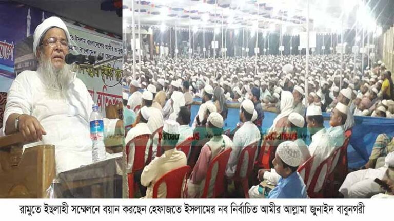 হেফাজতে ইসলাম বাংলাদেশের আমীর নির্বাচিত হওয়ার পর প্রথম জনসম্মুখে বক্তব্য রাখলেন আল্লামা জুনাইদ বাবুনগরী। সোমবার (১৬ নভেম্বর) তিনি ঐতিহ্যবাহি দ্বীনি শিক্ষা প্রতিষ্ঠান রামু চাকমারকুল আল-জামিয়া আল ইসলামীয়া দারুল উলূম মাদ্রাসার ইছ্লাহী মাহফিল ও অভিভাবক সম্মেলনে প্রধান মেহমান হিসেবে বয়ান করেন।