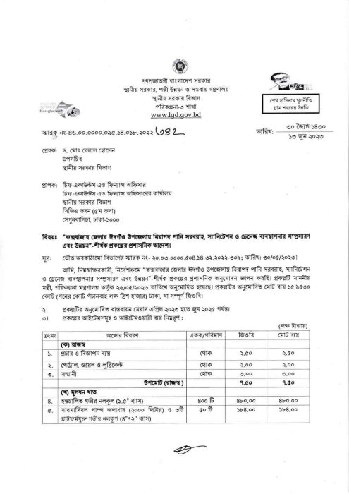 প্রাপ্ত তথ্যে জানা যায়, গত ১৩ জুন স্থানীয় সরকার, পল্লী উন্নয়ন ও সমবায় মন্ত্রণালয়ের স্থানীয় সরকার বিভাগের পরিকল্পনা ৩ শাখার উপসচিব ডা. বেলাল হোসেন স্বাক্ষরিত পত্রে কক্সবাজার জেলায় নবগঠিত ঈদগাঁও উপজেলায় “নিরাপদ পানি সরবরাহ, স্যানিটেশন ও ড্রেনেজ ব্যবস্থাপনা সম্প্রসারণ” শীর্ষক প্রকল্প বাস্তবায়নের জন্য সংশ্লিষ্ট কর্তৃপক্ষ ১৫ কোটি ৯৫ লাখ ৩০ হাজার টাকার একটি প্রকল্প গত ২৬ জুন গণপ্রজাতন্ত্রী বাংলাদেশ সরকারের পরিকল্পনা মন্ত্রণালয়ের মাননীয় মন্ত্রী কর্তৃক অনুমোদিত হয় । প্রকল্পটি বাস্তবায়নের সময় নির্ধারণ হয় এপ্রিল ২০২৩ থেকে জুন ২০২৫ পর্যন্ত।