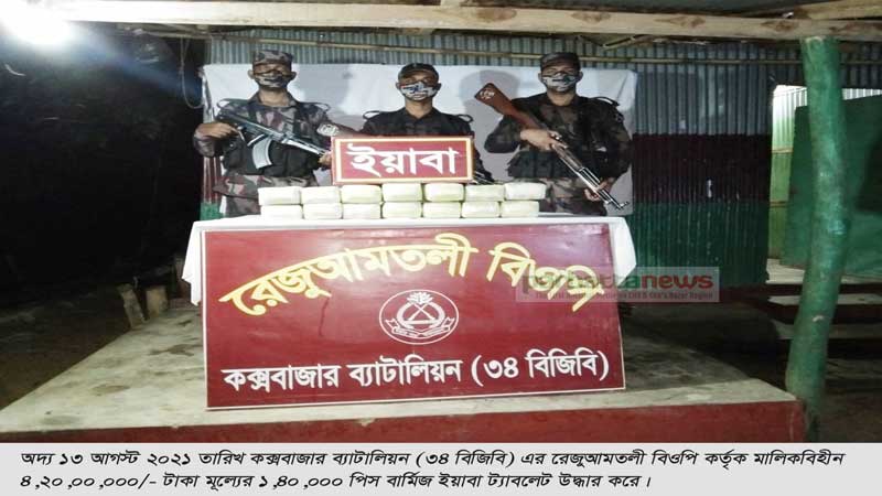 কক্সবাজার ব্যাটালিয়ন (৩৪ বিজিবি) এর রেজুআমতলী বিওপি কর্তৃক শুক্রবার দিবাগত (১৩ আগস্ট) রাতে ১,৪০,০০০ (এক লক্ষ চল্লিশ হাজার) পিস বার্মিজ ইয়াবা ট্যাবলেট উদ্ধার করে।