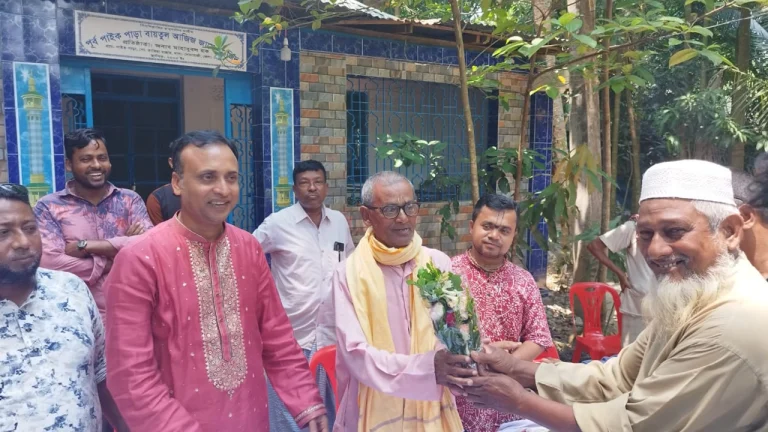 এ সময় উপস্থিত হিন্দু সম্প্রদায়ের পরিবারের লোকজনকে ফুল দিয়ে বরণ করেন মুসলিম পরিবারের লোকজন।