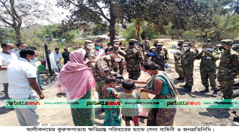 বান্দরবানের আলীকদম উপজেলার কুরুকপাতায় পুড়ে যাওয়া তিনটি বাড়ির সদস্যদের নগদ অর্থ, খাদ্যসামগ্রী ও পরিধেয় কাপড় বিতরণ করেছেন আলীকদম জোন কমান্ডার লে. কর্নেল সাইফ শামীম, পিএসসি।