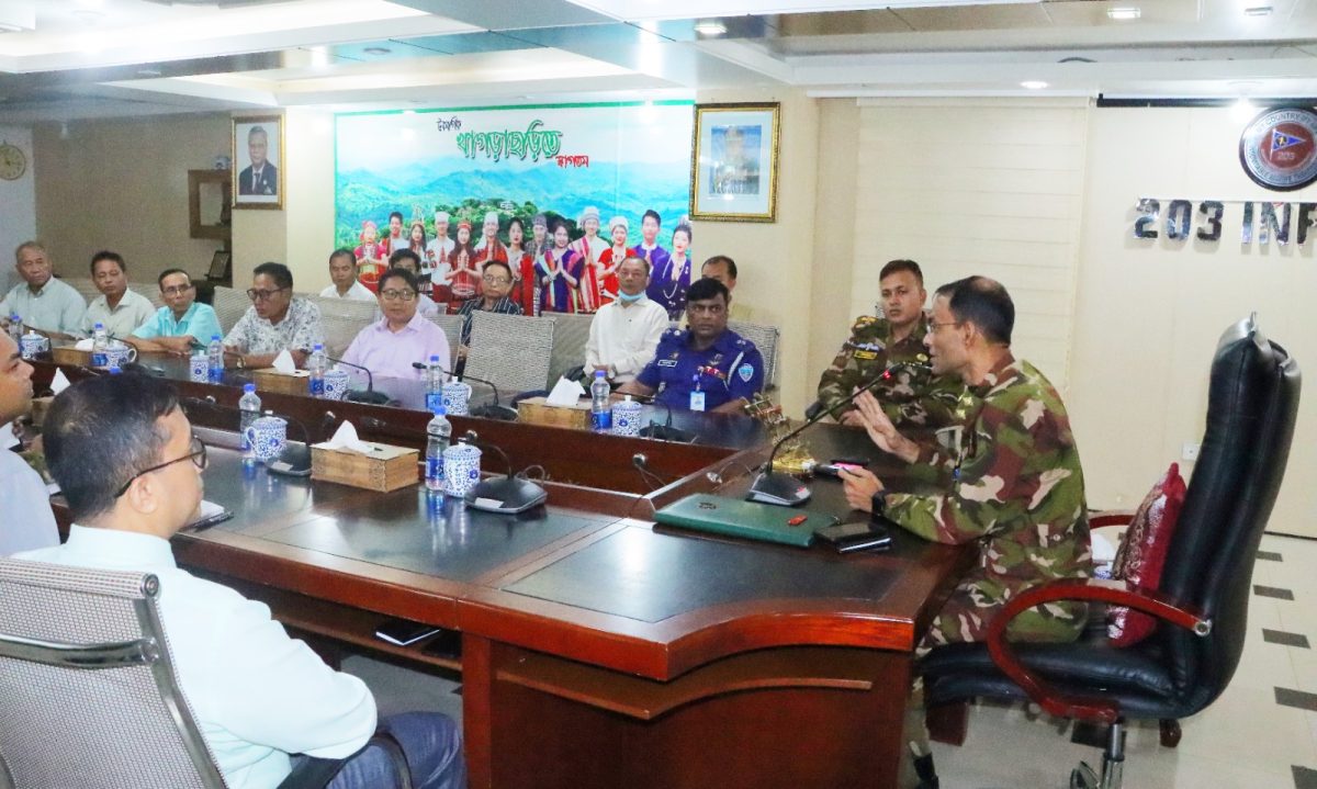 বৃহস্পতিবার (৩ অক্টোবর) খাগড়াছড়ি রিজিয়নের কনফারেন্স রুমে অনুষ্ঠিত বৈঠকে মধু মঙ্গল চাকমা, ড. সুধীন কুমার চাকমা, ডা শহীদ তালুকদার, প্রবীন চন্দ্র চাকমা, ম্রাসাথোয়াই মারমা, শেপালীকা ত্রিপুরা ও সুশীল জীবন ত্রিপুরা বিশিষ্ট পাহাড়ি নেতৃবৃন্দ উপস্থিত ছিলেন।