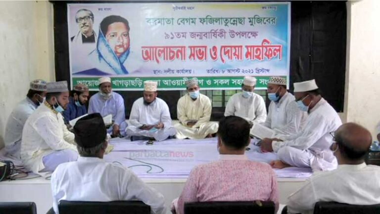দোয়া মাহফিল, আলোচনা সভাসহ নানা আয়োজনের মধ্যে দিয়ে বঙ্গমাতা বেগম ফজিলাতুন্নেসা মুজিবের ৯১তম জন্মবাষির্কী পালন করেছে খাগড়াছড়ি জেলা আওয়ামী লীগ। দিনটি উপলক্ষে রবিবার (০৮ আগস্ট) সকালে শহরের নারিকেল বাগানস্থ জেলা আওয়ামী লীগের দলীয় কার্যালয়ে দোয়া মাহফিল ও আলোচনা সভা অনুষ্ঠিত হয়।