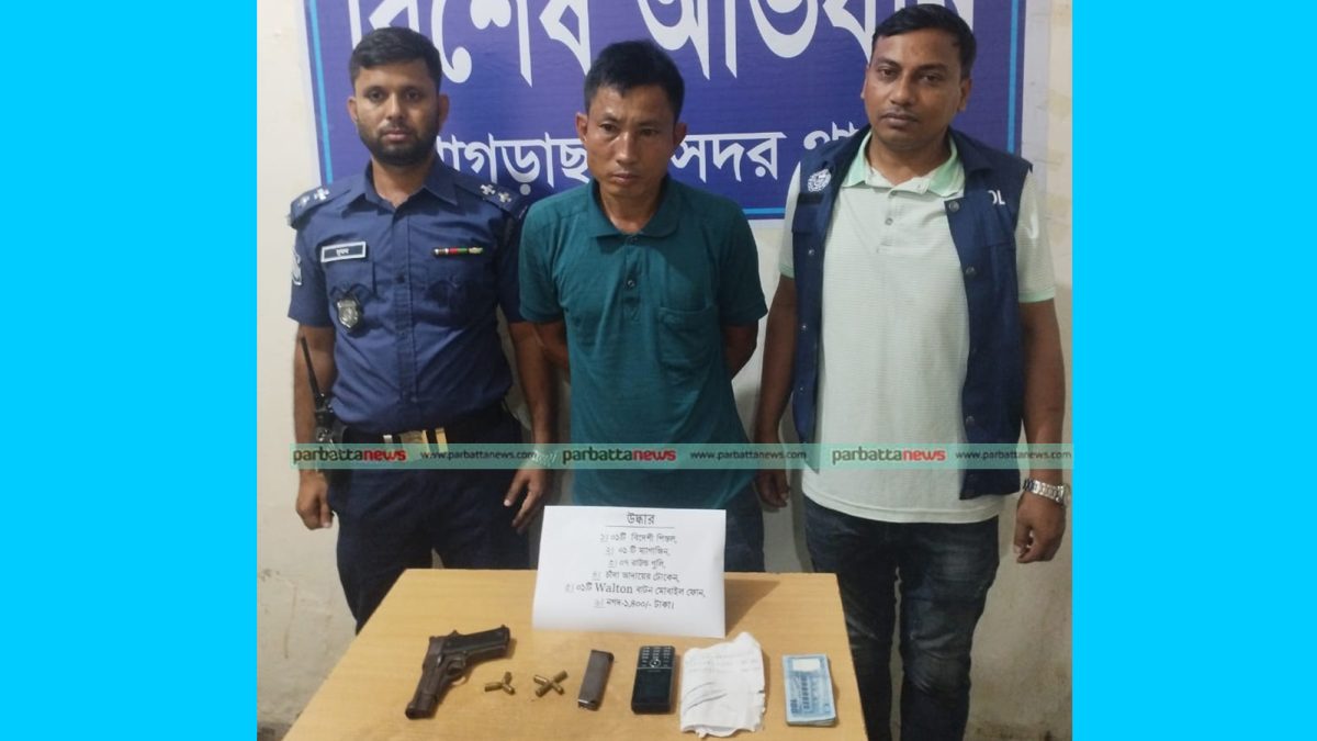 খাগড়াছড়ি থানাধীন পেরাছড়া ইউনিয়নের দক্ষিণ হেডম্যান পাড়া ব্রিক ফিল্ড নামক স্থানের যাত্রী ছাউনির পাশে অনিমেষের চায়ের দোকানের সামনে থেকে পিস্তলসহ এক চাঁদাবাজকে আটক করা হয়েছে।
