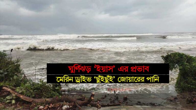 ঘুর্ণিঝড় ‘ইয়াস’ এর প্রভাবে সমুদ্রে জোয়ারের পানি বেড়ে মেরিন ড্রাইভ প্রায় ছুঁয়েছে। ঢেউয়ের শেষ আচড়টা পড়ছে সোজা মেরিন ড্রাইভ সড়কে। কিছু কিছু এলাকায় সাগরতীরের মাটি ভেঙে পড়েছে।
