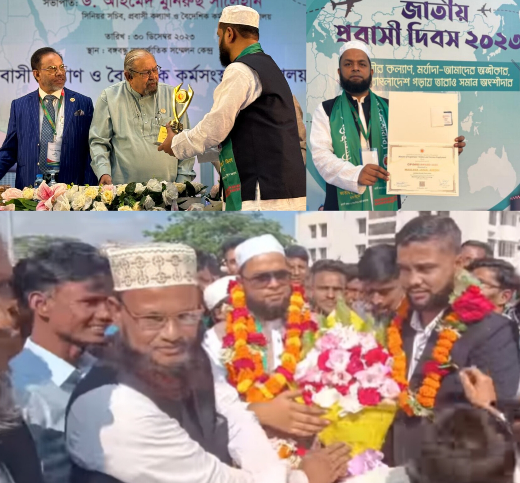 ঢাকা আগারগাঁও বঙ্গবন্ধু আন্তর্জাতিক সম্মেলন কেন্দ্রে জাতীয় প্রবাসী দিবসের অনুষ্ঠানে প্রবাসী কল্যাণ ও বৈদেশিক কর্মসংস্থানমন্ত্রী ইমরান আহমদ তাঁকে সিআইপি এ্যাওয়ার্ড ও সম্মাননা তুলে দেন।