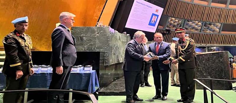 বৃহস্পতিবার (২৫ মে) জাতিসঙ্ঘ সদরদফতরে এ উপলক্ষ্যে আয়োজিত এক অনুষ্ঠানে জাতিসংঘ মহাসচিব আন্তোনিও গুতেরেজের কাছ থেকে বাংলাদেশের পক্ষে এ মেডেল গ্রহণ করেন জাতিসঙ্ঘে নিযুক্ত বাংলাদেশের স্থায়ী প্রতিনিধি রাষ্ট্রদূত মোহাম্মদ আবদুল মুহিত।