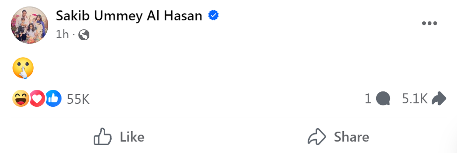 ফেসুবক স্ট্যাটাসে দেখা যায় শুধু একটি ইমোজি দিয়ে কাউকে চুপ থাকতে বলেছেন শিশির। তবে সাকিবপত্নীর এমন স্ট্যাটাস কাকে উদ্দেশ্য করে তা বুঝা যায়নি।