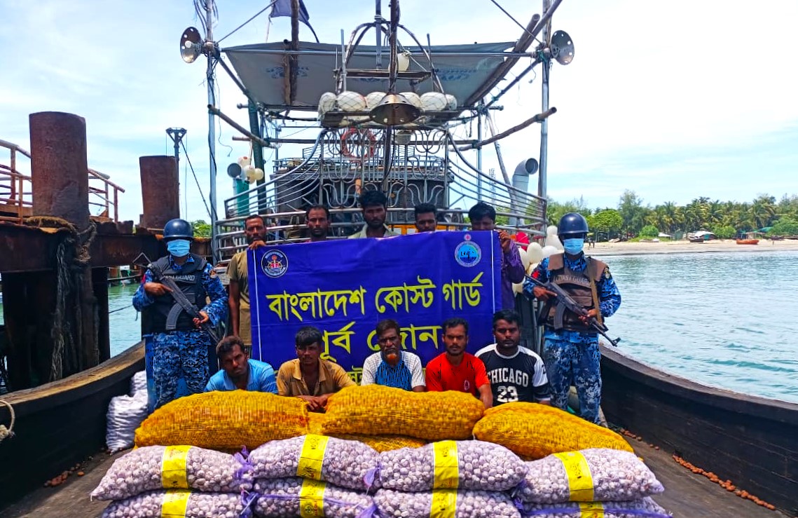 এসময় উক্ত এলাকায় একটি সন্দেহজনক ফিশিং বোটে তল্লাশি চালিয়ে অবৈধভাবে শুল্ক-কর ফাঁকি দিয়ে মিয়ানমারে পাচারকালে প্রায় ৭ লাখ টাকা মূল্যের ৪০০ বস্তা আলু, ৪০ বস্তা রসুন ও পাচার কাজে ব্যবহৃত ফিশিং বোটসহ ১০ জন পাচারকারীকে আটক করা হয়।