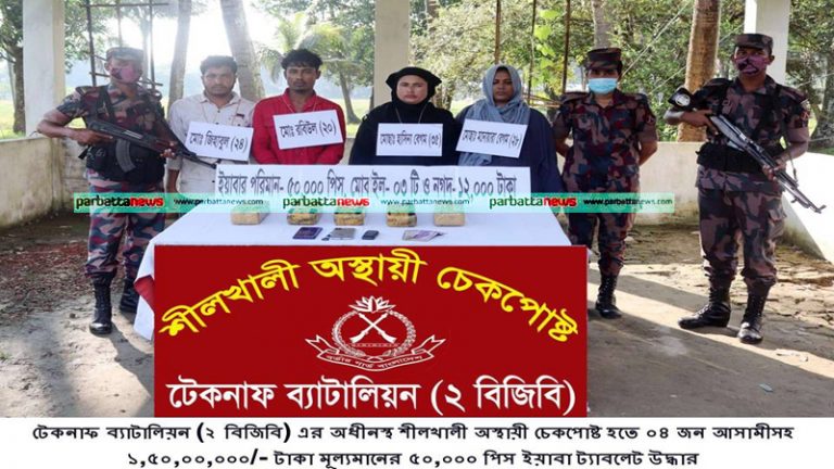 টেকনাফের শীলখালীতে ৫০ হাজার পিস ইয়াবার চালানসহ ৪ জন নারী-পুরুষ পাচারকারীকে আটক করেছে বর্ডার গার্ড বাংলাদেশ (বিজিব)।