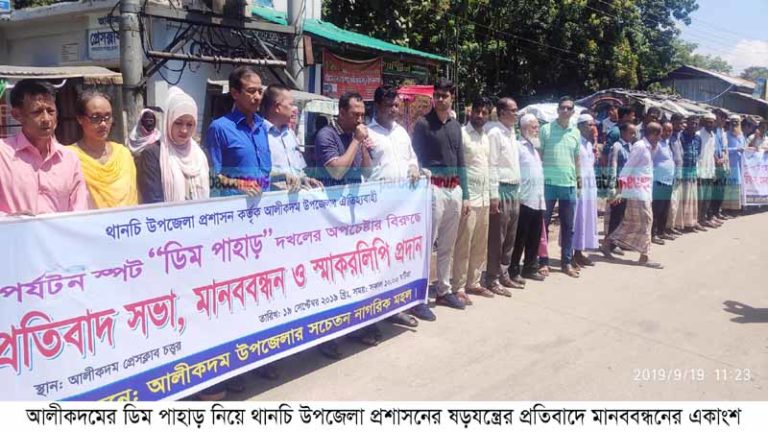 চিম্বুক পাহাড় শ্রেণির অংশ ‘ডিম পাহাড়’ এর দখল নিয়ে থানচি উপজেলা প্রশাসনের বিরুদ্ধে ষড়যন্ত্রের অভিযোগ করে আলীকদম প্রেসক্লাবের সামনে বৃহস্পতিবার ‘সচেতন নাগরিক মহল’ এর ব্যানারে মানববন্ধন অনুষ্ঠিত হয়। মানববন্ধন শেষে ডিম পাহাড় পার্বত্য আলীকদম উপজেলারই অংশ দাবি করে বান্দরবান জেলা প্রশাসক বরাবর স্মারকলিপি প্রদান করা হয়।