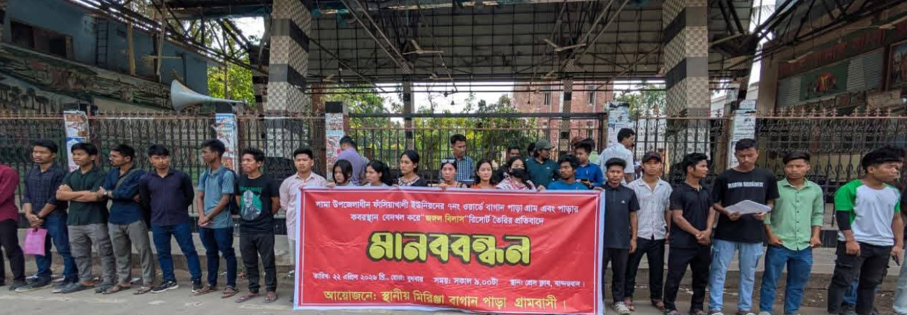 লামায় ফাঁসিয়াখালীতে বাগান পাড়া গ্রাম ও কবর স্থান বেদখল করে ‘জঙ্গল বিলাস রিসোর্ট’ তৈরীর প্রতিবাদে মানববন্ধন করেছে মিরিঞ্জা পাড়া গ্রামবাসী।