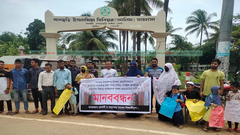 বৃহস্পতিবার (১৫ জুন) সকালে পানছড়ি ইসলামিয়া সিনিয়র (আলিম) মাদ্রাসার সামনে আয়োজিত মানববন্ধনে এলাকার সকল স্তরের জনগণ ও মাদ্রাসার সাবেক শিক্ষার্থীরা অংশ নেন।