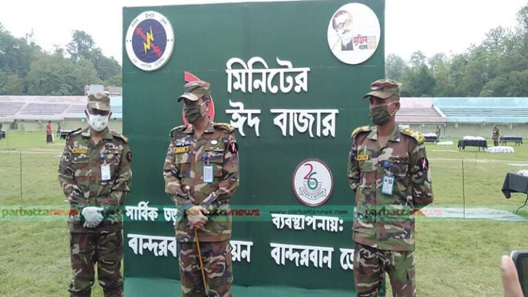 শুক্রবার (২২ মে) সকালে বান্দরবান স্টেডিয়ামে ঈদ বাজার এর আয়োজন করা হয়। মেজর জেনারেল এস এম মতিউর রহমান ২৪ পদাতিক ডিভিশন ও এরিয়া কমান্ডার চট্টগ্রাম এরিয়া এর নির্দেশে বান্দরবান রিজিয়ন কর্তৃক বান্দরবান জেলা স্টেডিয়ামে অসহায়, দুস্থ ও নিম্ম আয়ের মানুষদের জন্য বান্দরবান রিজিয়ন কর্তৃক “ঈদ বাজার” নামে এই আয়োজন করা হয়। নাম এক মিনিটের বাজার হলেও সেনাবাহিনীর সম্পূর্ণ সেবাধর্মী উদ্যোগ এটি।