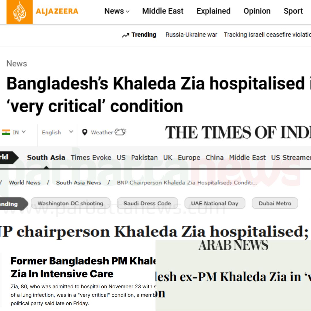 বাংলাদেশের সাবেক প্রধানমন্ত্রী ও বিএনপি চেয়ারপারসন খালেদা জিয়া ‘অত্যন্ত সংকটাপন্ন’ অবস্থায় রাজধানীর এভারকেয়ার হাসপাতালে হাসপাতালে চিকিৎসাধীন। সাবেক প্রধানমন্ত্রীর গুরুতর অসুস্থতার খবরটি এখন আন্তর্জাতিক গণমাধ্যমগুলোর প্রধান শিরোনামে উঠে এসেছে। কাতারভিত্তিক সংবাদমাধ্যম আল জাজিরা, গালফ নিউজ, ডন নিউজ, রয়টার্স, এএফপি এবং বিবিসি সহ বিভিন্ন প্রভাবশালী বিশ্ব মিডিয়ায় খালেদা জিয়ার স্বাস্থ্য নিয়ে প্রতিবেদন প্রকাশিত হয়।