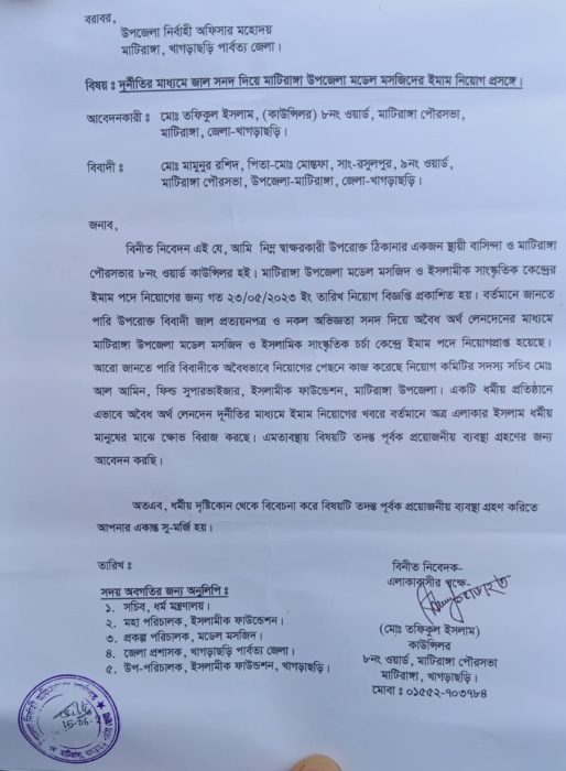 অভিযোগপত্রে বলা হয়, সদ্য নিয়োগপ্রাপ্ত ইমাম মামুনর রশিদ জাল প্রত্যয়নপত্র ও নকল অভিজ্ঞতা সনদ দিয়ে অবৈধ অর্থ লেনদেনের মাধ্যমে মাটিরাঙ্গা উপজেলা মডেল মসজিদ ও ইসলামি সংস্কৃতি চর্চা কেন্দ্রে ইমাম পদে নিয়োগপ্রাপ্ত হয়েছেন।