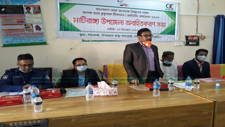 আগামী ২০২২ সালের মধ্যে বাংলাদেশ থেকে মরনব্যাধি জলাতঙ্ক নির্মুলে জাতীয় জলাতঙ্ক নির্মুল কর্মসূচি বাস্তবায়নে ব্যাপকহারে কুকুরের দেহে টিকাদান (এমডিভি) কার্যক্রম বিষয়ে অবহিতকরন সভায় উপজেলা স্বাস্থ্য ও পরিবার পরিকল্পনা কর্মকর্তা ডাঃ সারোয়ার আলমের সভাপতিত্বে অবহিত করন সভায় বক্তব্য রাখেন, মাটিরাঙ্গা উপজেলা প্রানী সম্পদ কর্মকর্তা পলাশ কান্তি চাকমা, মাটিরাঙ্গা উপজেলা মৎস্য কর্মকর্তা মো. আরিফুর রহমান, মাটিরাঙ্গা উপজেলা পরিষদের ভাইস চেয়ারম্যান মো. আনিসুজ্জামান ডালিম ও মাটিরাঙ্গা প্রেসক্লাবের সাধারণ সম্পাদক মুজিবুর রহমান ভুইয়া প্রমুখ বক্তব্য রাখেন। জলাতঙ্ক নির্মুলে জাতীয় জলাতঙ্ক নির্মুল কর্মসূচি বাস্তবায়নে সরকারের গৃহীত কর্মসূচি নিয়ে স্ববিস্তার তুলে ধরেন এমটিভি প্রোগ্রামের মাটিটরাঙ্গা উপজেলা সুপার ভাইজার মো. কামরুজ্জামান।