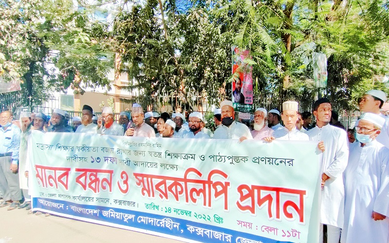মাদ্রাসা শিক্ষার স্বকীয়তা বজায় রাখার জন্য স্বতন্ত্র শিক্ষাক্রম ও পাঠ্যপুস্তক প্রণয়ণসহ ১৩ দফা দাবি আদায়ের লক্ষ্যে কক্সবাজারে মানববন্ধন অনুষ্ঠিত হয়েছে।