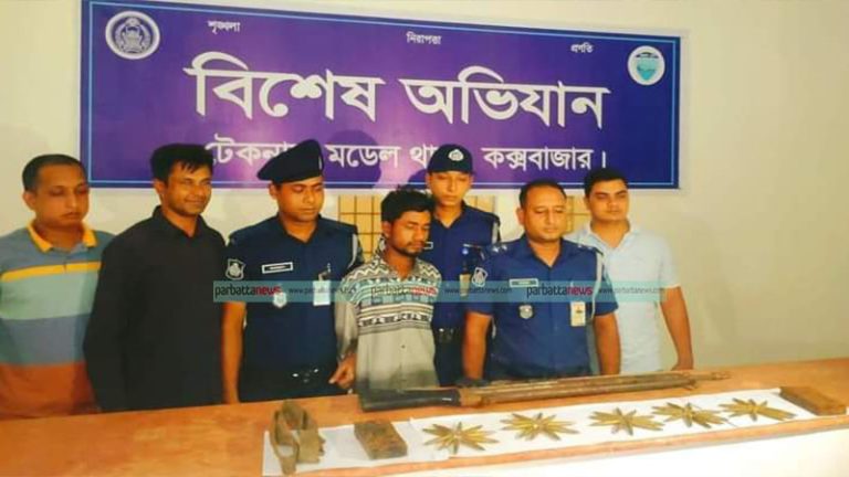 সোমবার (১ জুলাই) বিকাল সাড়ে ৪টায় টেকনাফ মডেল থানার সম্মেলন কক্ষে অফিসার্স ইনচার্জ মুহাম্মদ ওসমান গণি সংবাদ সম্মেলনে জানান, অস্ত্র-গুলি উদ্ধারের ৩ দিনের সাঁড়াশি অভিযানে সকাল পৌনে ৮টার দিকে টেকনাফ মডেল থানার একদল পুলিশ পৌরসভাস্থ ঝর্ণা চত্বর সংলগ্ন আল করম মসজিদের সামনে প্রধান সড়কে গোপন সংবাদের ভিত্তিতে বিশেষ চেকপোস্ট বসিয়ে যানবাহন তল্লাশি করার এক পর্যায়ে সুপারির বস্তাসহ রামু গর্জনিয়ার পূর্ব জুমছড়ির মনির আহমদের ছেলে হেলাল উদ্দিনকে (২৫) আটক করতে সক্ষম হয়। তবে এসময় মহেশখালীর ধলঘাটা পন্ডিতের ডেইলের লোকমান হাকিমের ছেলে মুহাম্মদ জুয়েল রানা (৩৫) পুলিশের উপস্থিতি বুঝতে পেরে কৌশলে পালিয়ে যায়। পরে বাজারে উপস্থিত জনতার সামনে সুপারির বস্তা খুলে তল্লাশি চালিয়ে বিশেষ কায়দায় লুকানো সিলিংযুক্ত প্লাস্টিকের বাটসহ একটি বিদেশি জি-৩ রাইফেল, (লম্বা ৩৯.৫ ইঞ্চি), ২টি ম্যাগজিন এবং ৫০ রাউন্ড তাঁজা গুলি জব্দ করা হয়। ধৃত আসামী ও পলাতক আসামীরা বিভিন্ন ধরণের অপরাধমূলক কর্মকাণ্ড সংঘটনের উদ্দেশ্যে বর্ণিত অস্ত্র-গুলি নিজ হেফাজতে রেখে ১৮৭৮ সনের অস্ত্র আইনের অপরাধে টেকনাফ মডেল থানার মামলা নং-০১/৩৫৫, তাং-০১/০৭/২০২৪ইং রুজু করে আদালতে প্রেরণ করেন।