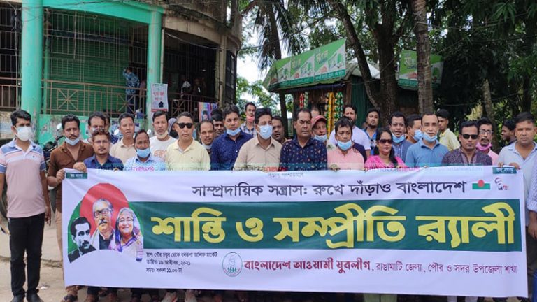 সাম্প্রদায়িক সন্ত্রাস রুখে দাঁড়াও বাংলাদেশ এই শ্লোগানে রাঙামাটি জেলা যুবলীগের উদ্যোগে শান্তি- সম্প্রীতির র্যালি ও সমাবেশ অনুষ্ঠিত হয়েছে।