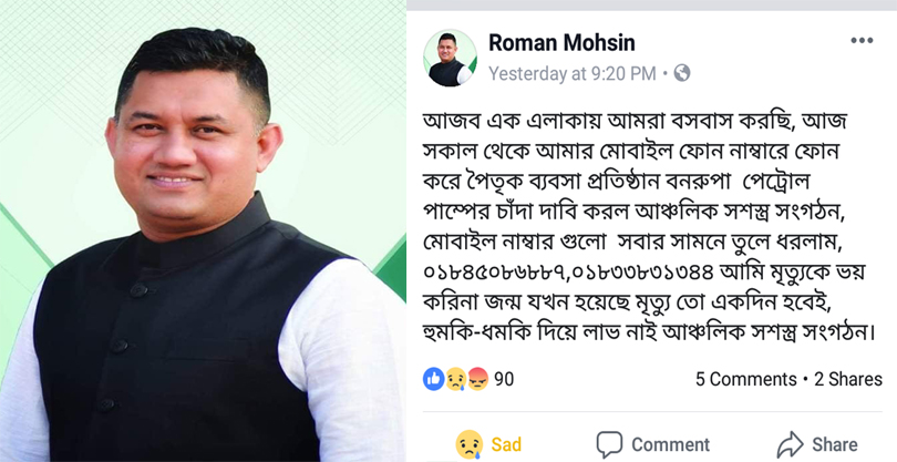 চেয়ারম্যান রোমান তার টাইমলাইনে লিখেন, ‘আজব এক এলাকায় আমরা বসবাস করছি। আজ সকাল থেকে আমার মোবাইল ফোন নাম্বারে ফোন করে পৈতৃক ব্যবসা প্রতিষ্ঠান বনরুপা পেট্রোল পাম্পের চাঁদা দাবি করল আঞ্চলিক সশস্ত্র সংগঠন। মোবাইল নাম্বারগুলো সবার সামনে তুলে ধরলাম। ০১৮৪৫০৮৬৮৮৭, ০১৮৩৩৮৩১৩৪৪। আমি মৃত্যুকে ভয় করিনা। জন্ম যখন হয়েছে মৃত্যু তো একদিন হবেই। হুমকি-ধমকি দিয়ে লাভ নাই আঞ্চলিক সশস্ত্র সংগঠন।’