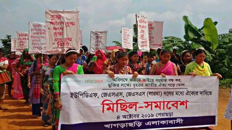 পার্বত্য চট্টগ্রামে আঞ্চলিক রাজনৈতিক দলগুলোর মধ্যেকার চলমান সংঘাত বন্ধ করে বৃহত্তর জুম্ম জাতীয় ঐক্য গড়ার দাবি জানিয়ে সমাবেশ করেছে খাগড়াছড়ি এবং রাঙামাটির কাউখালী, বাঘাইছড়ি ও সাজেক এলাকার জনসাধারণ।
