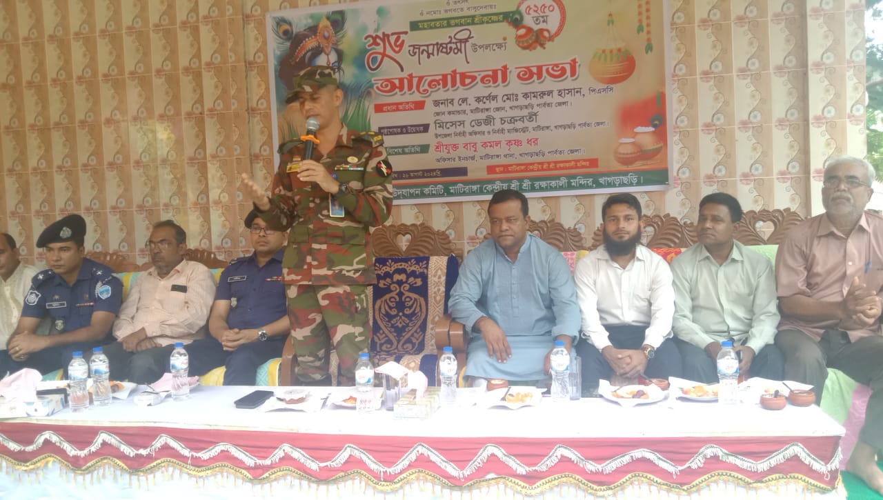 সোমবার (২৬ আগষ্ট) বেলা সাড়ে ১১টার দিকে মাটিরাঙ্গা কেন্দ্রীয় শ্রী শ্রী রক্ষা কালী মন্দিরে হিন্দু ধর্মালম্বীদের শ্রী কৃষ্ণের ৫২৫০ তম শুভ জন্মাষ্টমী উদযাপন অনুষ্ঠানে প্রধান অতিথির বক্তব্যে তিনি এসব কথা বলেন।