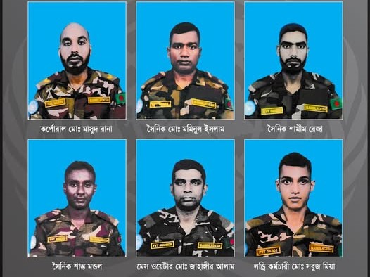 শহীদ শান্তিরক্ষীরা হলেন নাটোরের কর্পোরাল মো. মাসুদ রানা, কুড়িগ্রামের সৈনিক মো. মমিনুল ইসলাম, রাজবাড়ির সৈনিক শামীম রেজা, কুড়িগ্রামের সৈনিক শান্ত মন্ডল, কিশোরগঞ্জের মেস ওয়েটার মোহাম্মদ জাহাঙ্গীর আলম, গাইবান্ধার লন্ড্রি কর্মচারী মো. সবুজ মিয়া।