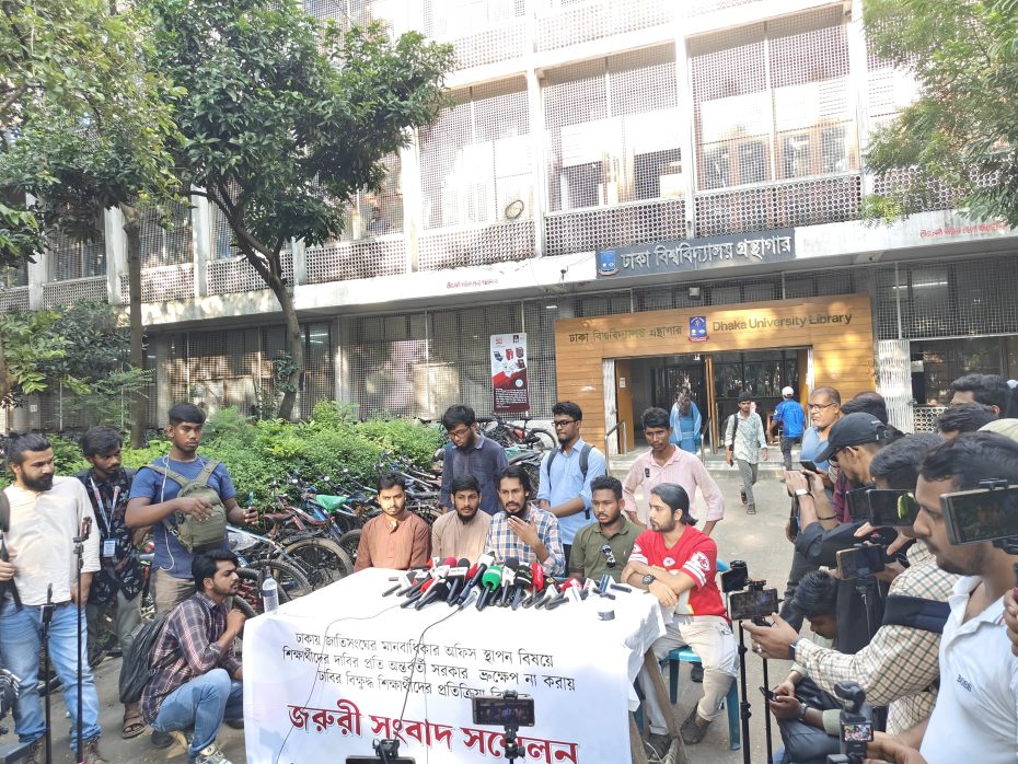 ঢাকায় জাতিসংঘের মানবাধিকার অফিস স্থাপনে শিক্ষার্থীদের আপত্তি ও দাবীর প্রতি অন্তর্বর্তী সরকার ভ্রুক্ষেপ না করায় প্রতিক্রিয়া জানিয়ে আজ ১০ আগস্ট ২০২৫ বিকেল ৪টায় ঢাকা বিশ্ববিদ্যালয়ের কেন্দ্রীয় গ্রান্থাগারের সামনে সংবাদ সম্মেলন করেছে ঢাকা বিশ্ববিদ্যালয়ের বিক্ষুব্ধ শিক্ষার্থীবৃন্দ।