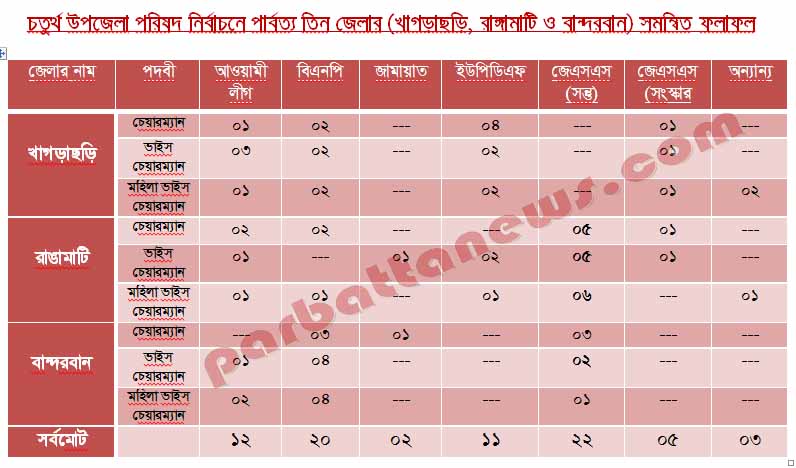 ঐতিহাসিক পার্বত্য শান্তিচুক্তি স্বাক্ষর, তৎকালীন শান্তিবাহিনীর অস্ত্র সমর্পণ, পার্বত্য চুক্তি বিরোধী আন্দোলনসহ নানা কারণে অত্যন্ত গুরুত্বপূর্ণ খাগড়াছড়ি পার্বত্য জেলায় তিন ধাপে আট উপজেলার নির্বাচনে চারটিতে ইউপিডিএফ, দু‘টিতে বিএনপি, একটিতে আওয়ামীলীগ ও একটিতে জেএসএস (এমএন লারমা) সমর্থিত প্রার্থীরা চেয়ারম্যান পদে বিজয়ী হয়েছে।