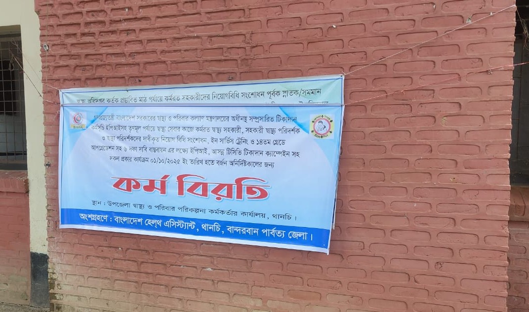 বান্দরবানের থানচি উপজেলার বাংলাদেশ হেলথ অ্যাসিস্ট্যান্ট অ্যাসোসিয়েশনের স্বাস্থ্য সহকারীরা ৬ দফা দাবিতে স্বাস্থ্য কমপ্লেক্স’র দেওয়ালে ব্যানার টাঙিয়ে কর্মবিরতি পালন করেছে।